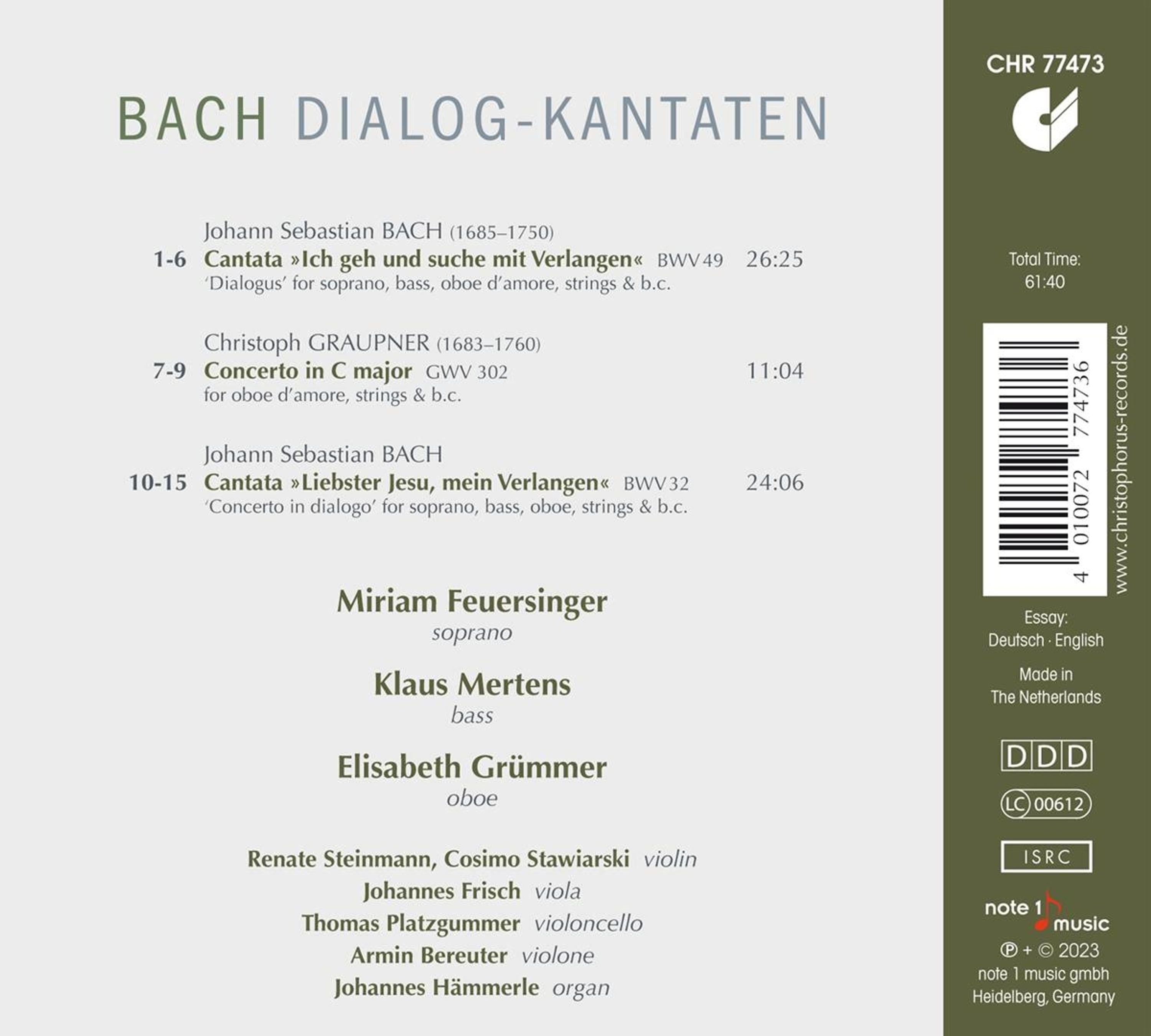 GBO: Henning Vater (Violin 1); Britta Gemmeker (Violin 2); Esther Jasmin Becker (Viola 1); Carsten Armbrecht (Viola 2); Angelika Miklin (Violoncello/Violoncello piccolo); Laura Frey (Violone); Britta Hauenschild (Transverse Flute); Martin Jelev, Almute Zwiener (Oboes/Oboes d'amore); Fréderique Brillouin (Oboe da caccia); Rhoda Patrick (Bassoon)