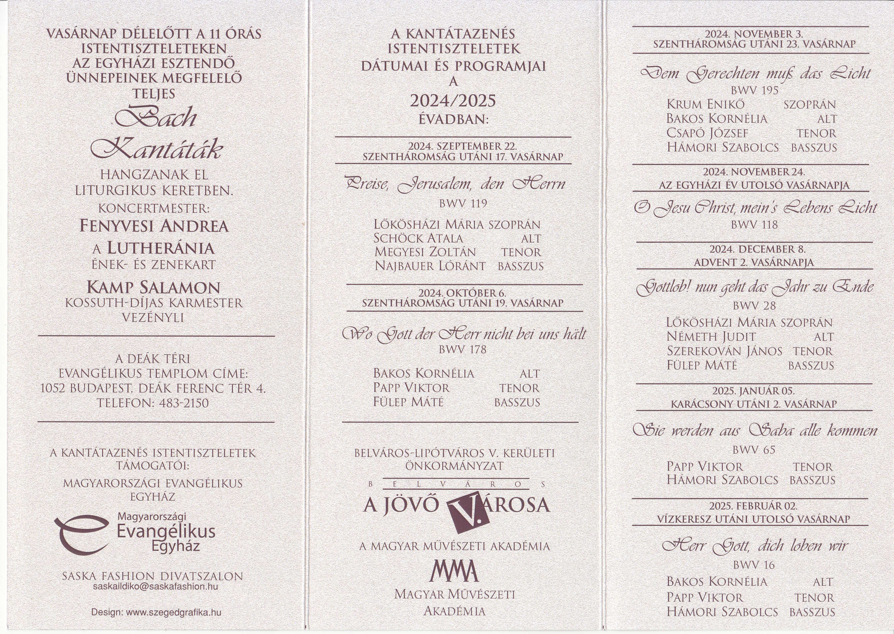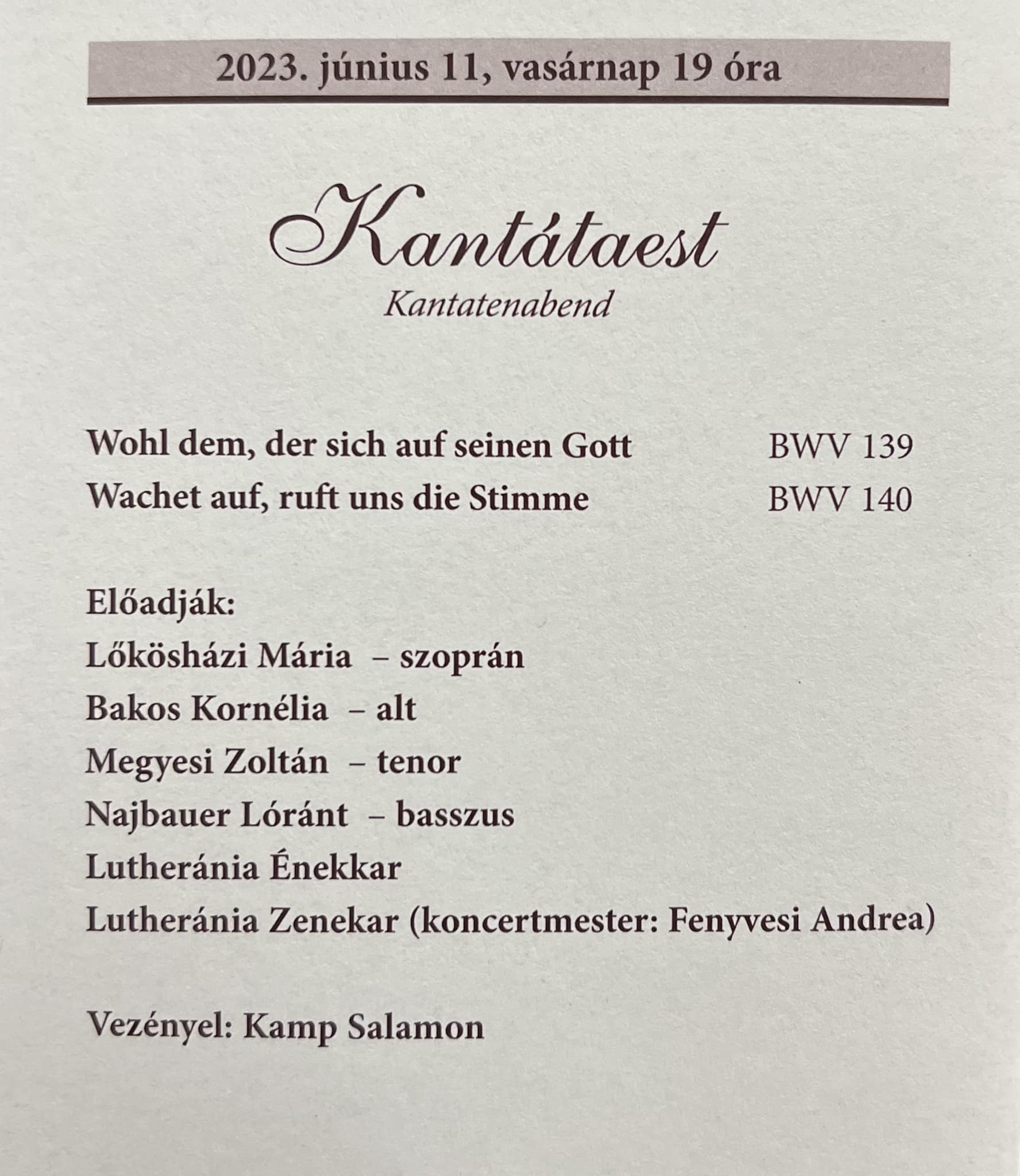 Soloists: Soprano: Anna Subedi [BWV 177]; Alto: Kornélia Bakos [BWV 177 & 178]; Tenor: Viktor Papp [BWV 177 & 178, video] or János Serekovan [poster]; Bass: Szabolcs Hámori [BWV 178]